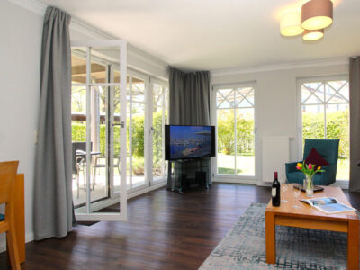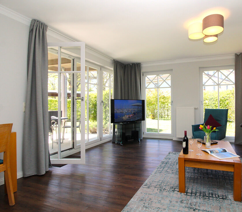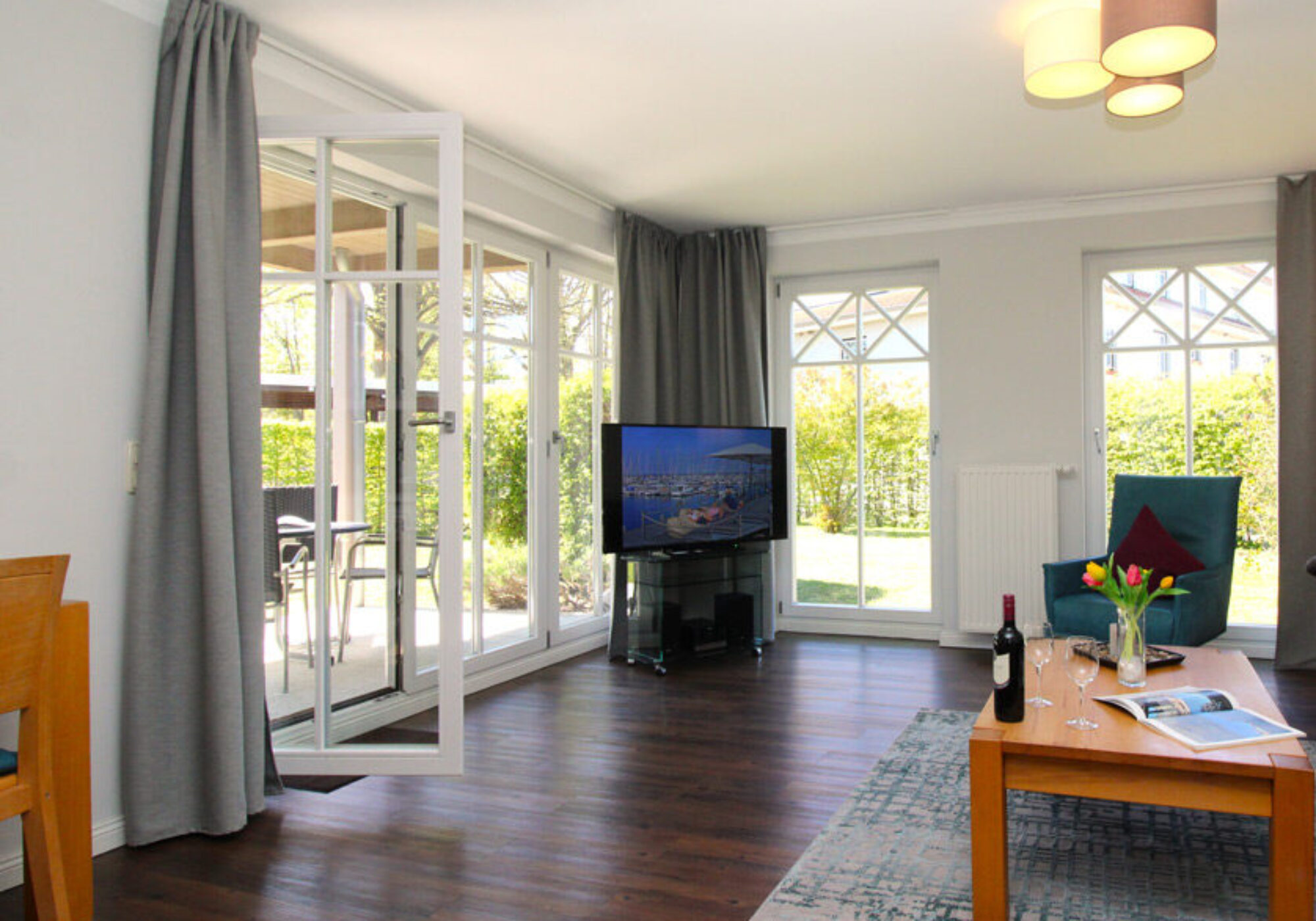Von der Gartenterrasse hat man einen Blick auf das wunderschöne und idyllische Salzhaff.