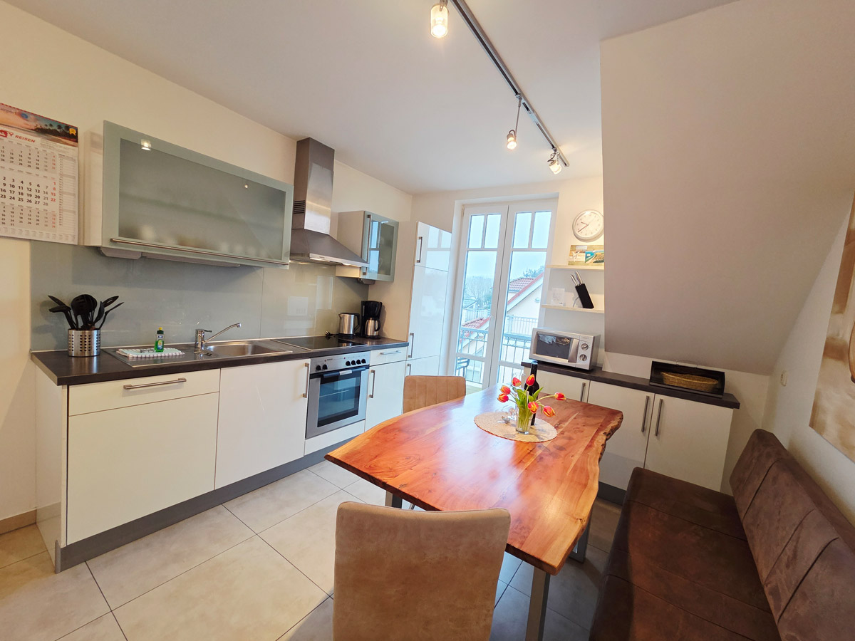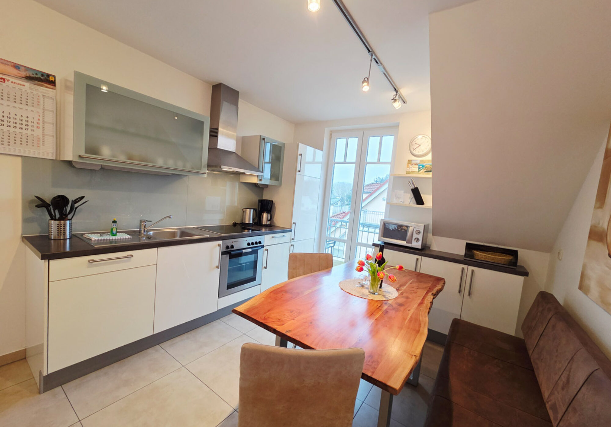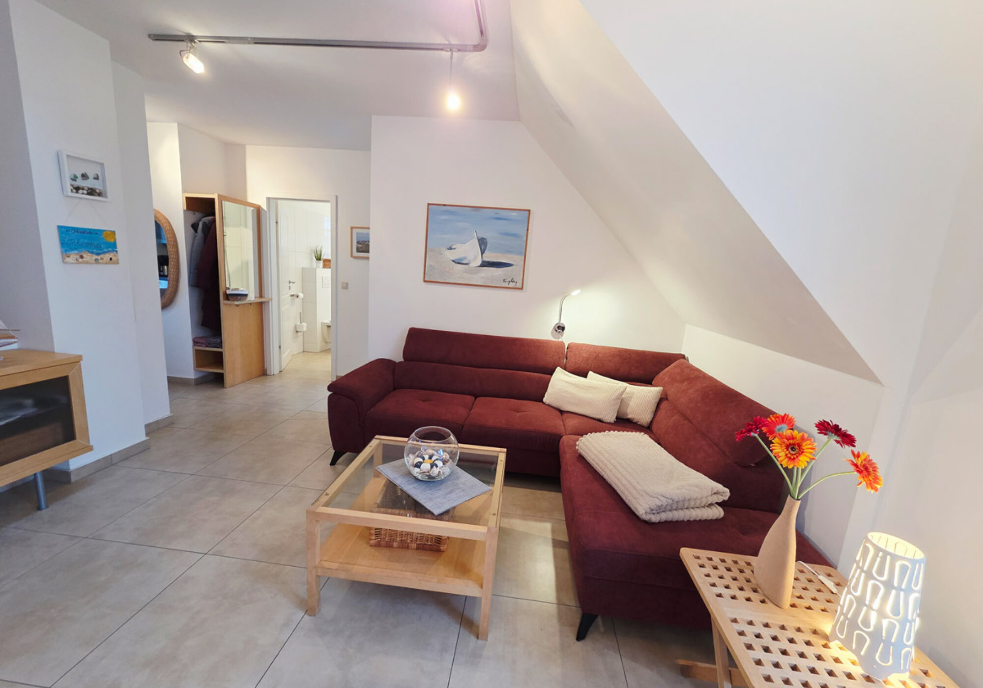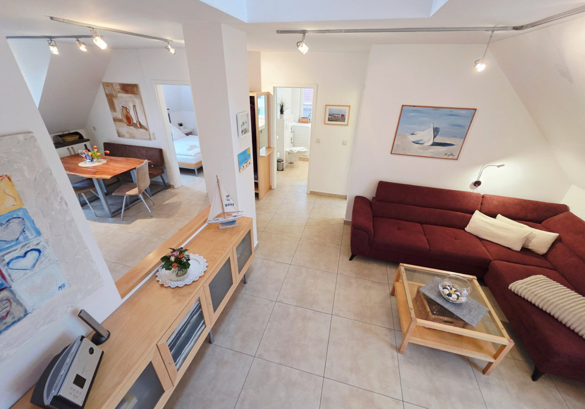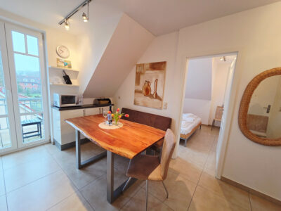 Die gemütliche Ferienwohnung verfügt über einen offenen Wohn- und Küchenbereich mit integrierter Küche, einem Schlafzimmer mit einem Doppelbett (die Maße sind 1,60 m + 2,00 m) und im Wohnzimmer ist eine ausziehbare Schlafcouch (Maße 1,60 m x 2,00 m) sowie ein Badezimmer mit Dusche und WC.