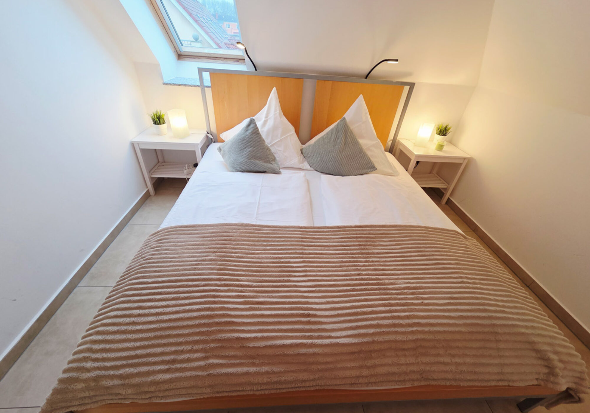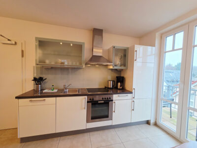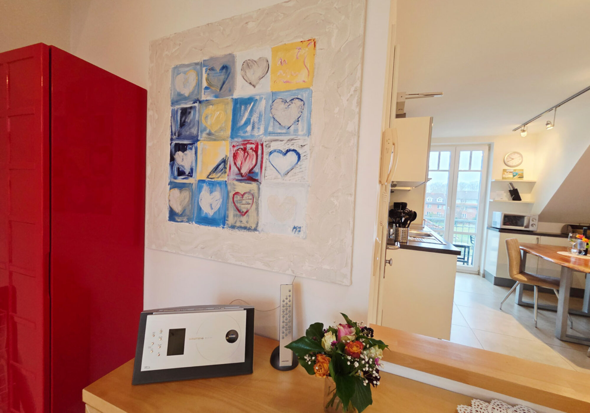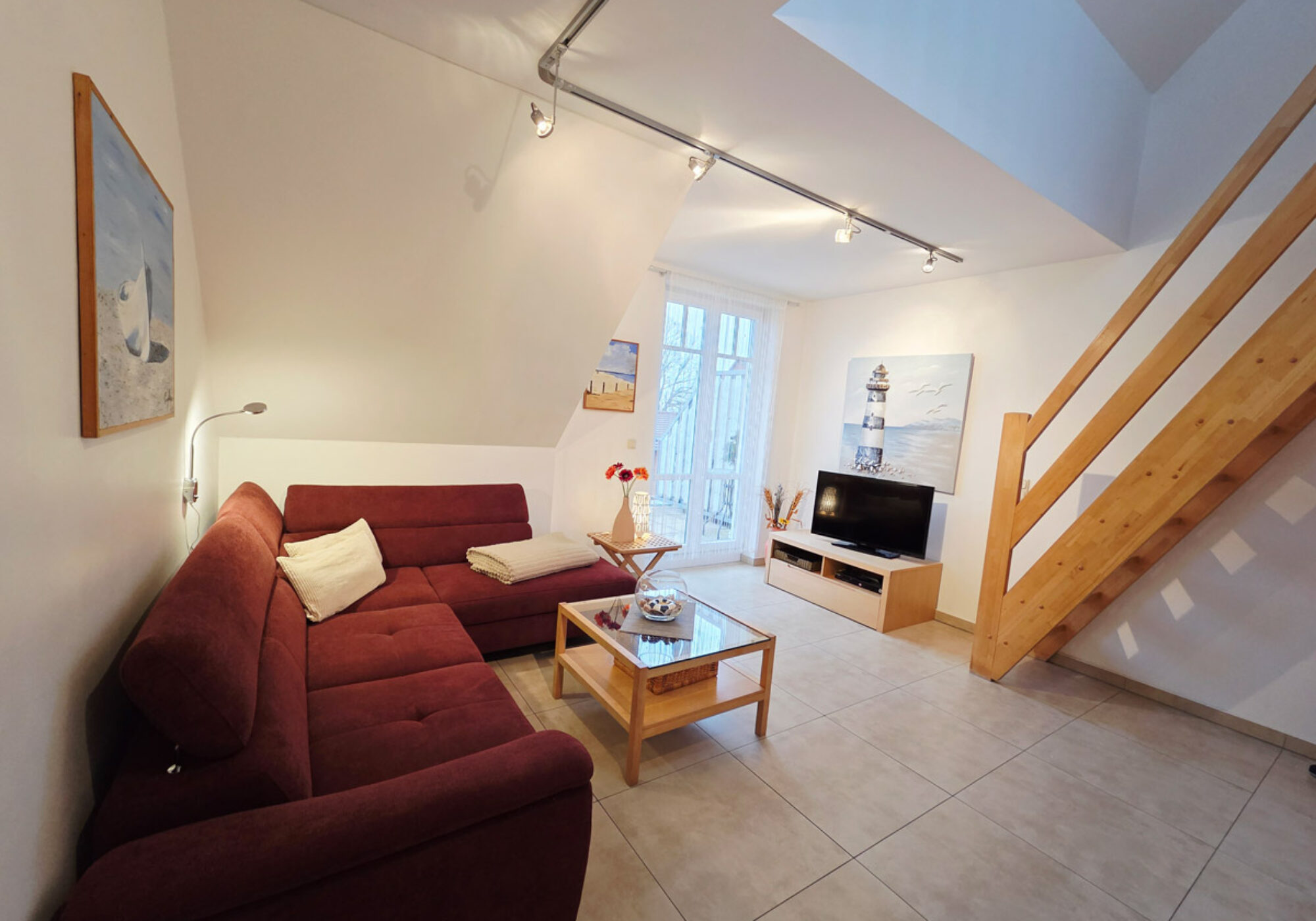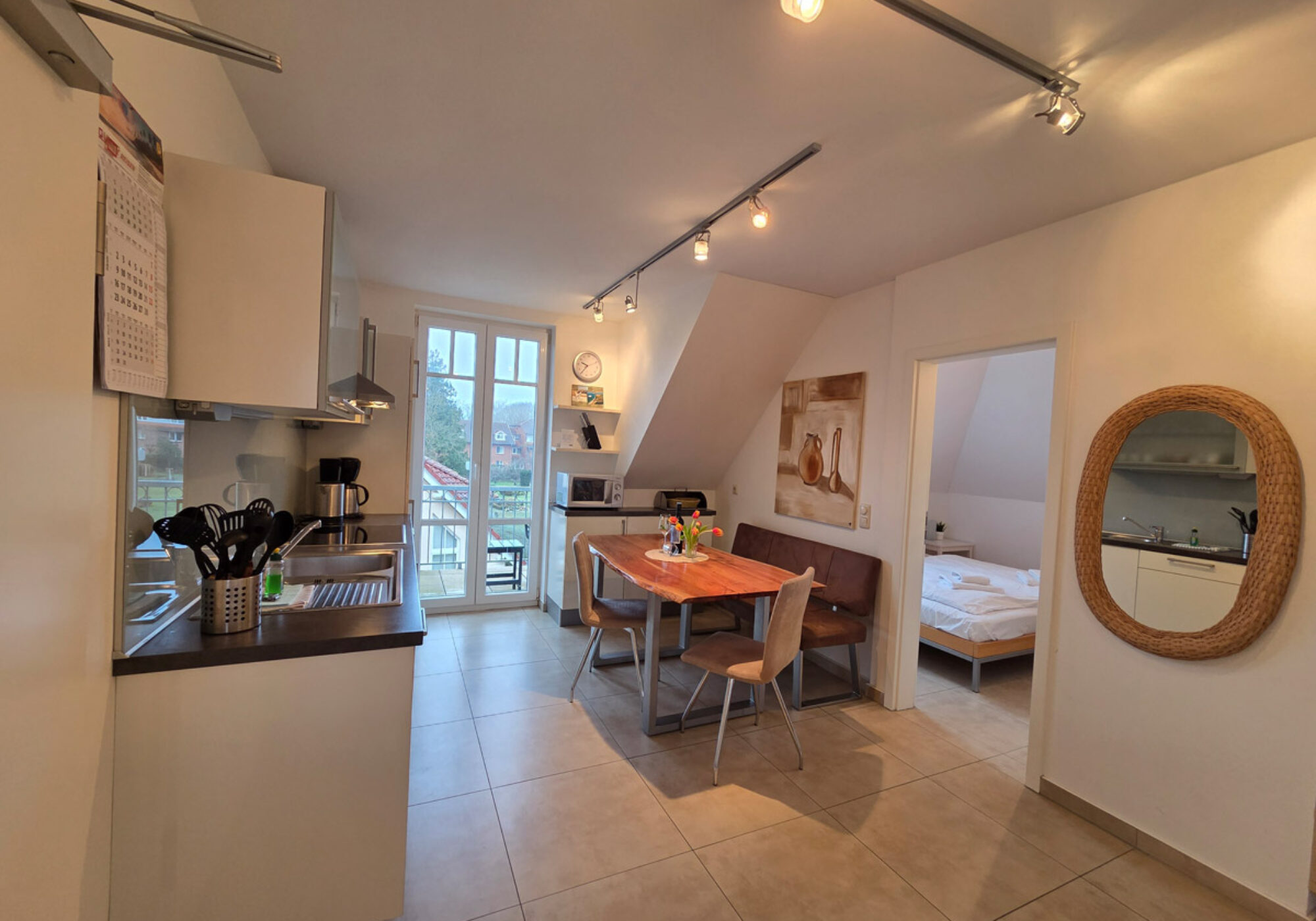 Die gemütliche Ferienwohnung verfügt über einen offenen Wohn- und Küchenbereich mit integrierter Küche, einem Schlafzimmer mit einem Doppelbett (die Maße sind 1,60 m + 2,00 m) und im Wohnzimmer ist eine ausziehbare Schlafcouch (Maße 1,60 m x 2,00 m) sowie ein Badezimmer mit Dusche und WC.