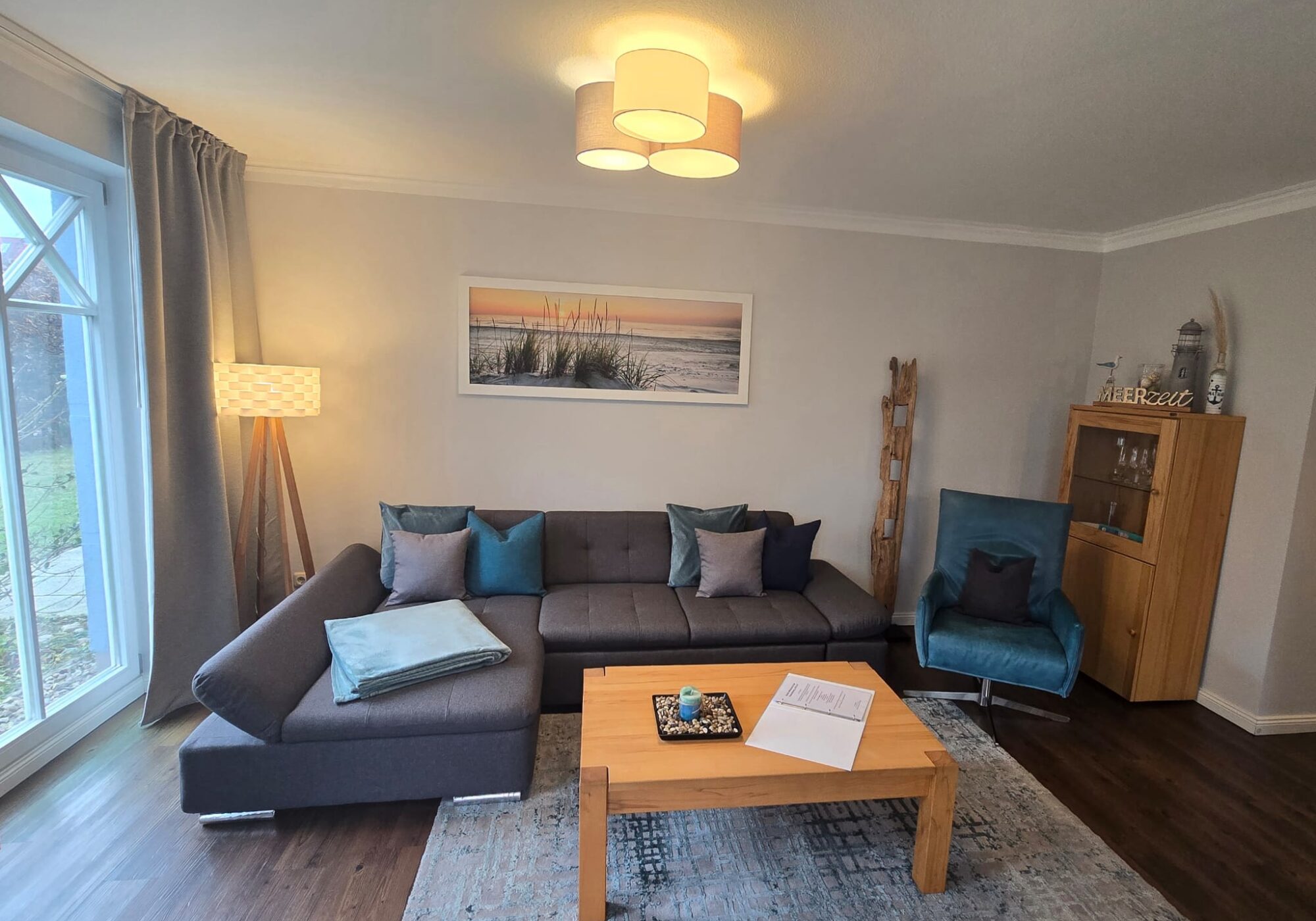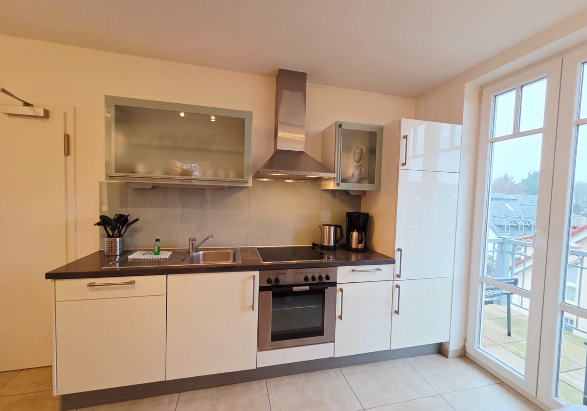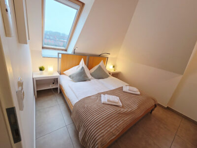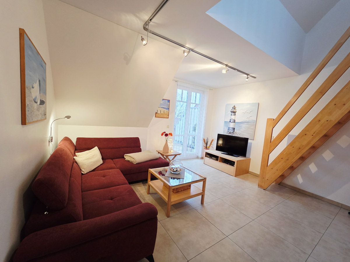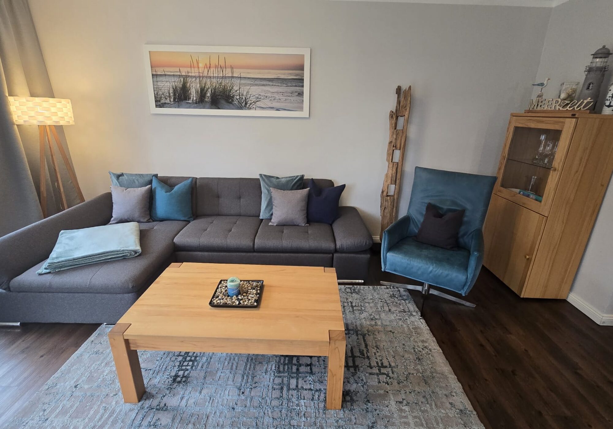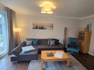 Die gemütliche Ferienwohnung verfügt über einen offenen Wohn- und Küchenbereich mit integrierter Küche, einem Schlafzimmer mit einem Doppelbett (die Maße sind 1,60 m + 2,00 m) und im Wohnzimmer ist eine ausziehbare Schlafcouch (Maße 1,60 m x 2,00 m) sowie ein Badezimmer mit Dusche und WC.